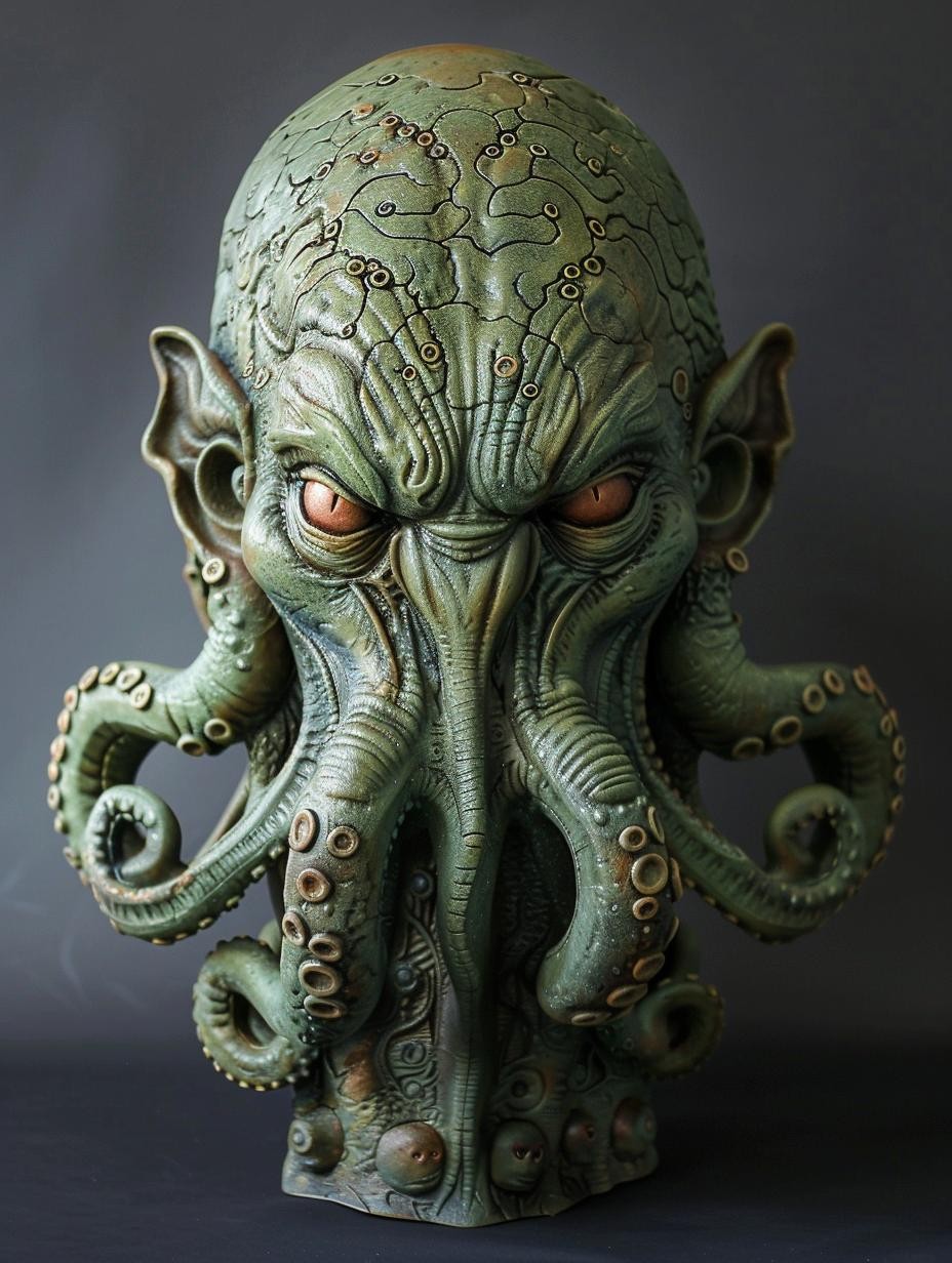 克苏鲁(Cthulhu)是美国作家H.P.洛夫克拉夫特(H.P. Lovecraft)创造的虚构角色之一,首次出现于其1928年发表的短篇小说《克苏鲁的呼唤》(The Call of Cthulhu)。克苏鲁形象巨大而可怖,通常被描绘为有着触须脸、巨大的双翼和鳞片状的身体,半人半龙半章鱼的外观。克苏鲁并不仅仅是一个生物,它象征着洛夫克拉夫特作品中那些超越人类理解、不可名状的恐怖存在。