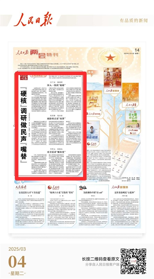 昨日,人民日报对全媒体矩阵采编内容进行选稿时,证券时报一篇聚焦上市公司代表委员一线调研、“把脉开方”促发展的故事受到关注。3月4日,该故事以《锚定新质生产力 代表委员“脚沾泥” “硬核”调研做民声“嘴替”》为题,刊登在了人民日报两会特刊14版上。