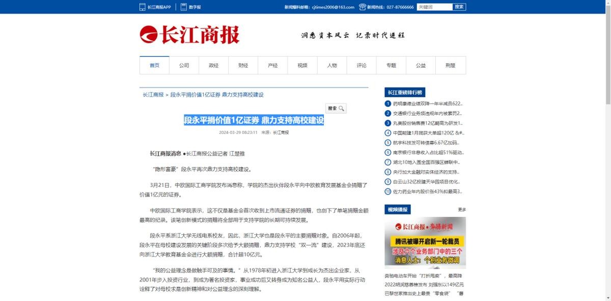 长江商报 2024-3-29——段永平捐价值1亿证券 鼎力支持高校建设
