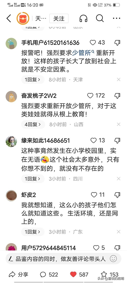 还有网友说:开放少管所,报警吧!强烈要求少管所重新开放!这样的孩子长大了放到社会上就是不安定因素。