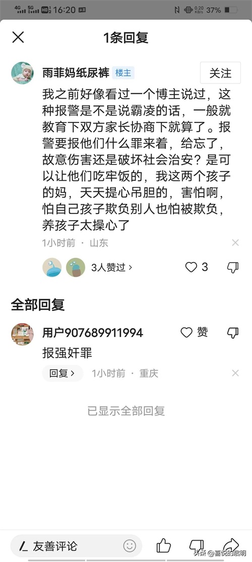 还有网友评论:这是故意伤害?破坏社会治安?之前好像看过一个博主说过,这种报警是不是说霸凌的话,一般就教育下双方家长协商下就算了。报警要报他们什么罪来着,给忘了,故意伤害还是破坏社会治安?是可以让他们吃牢饭的,我这两个孩子的妈,天天提心吊胆的,害怕啊,怕自己孩子欺负别人也怕被欺负,养孩子太操心了