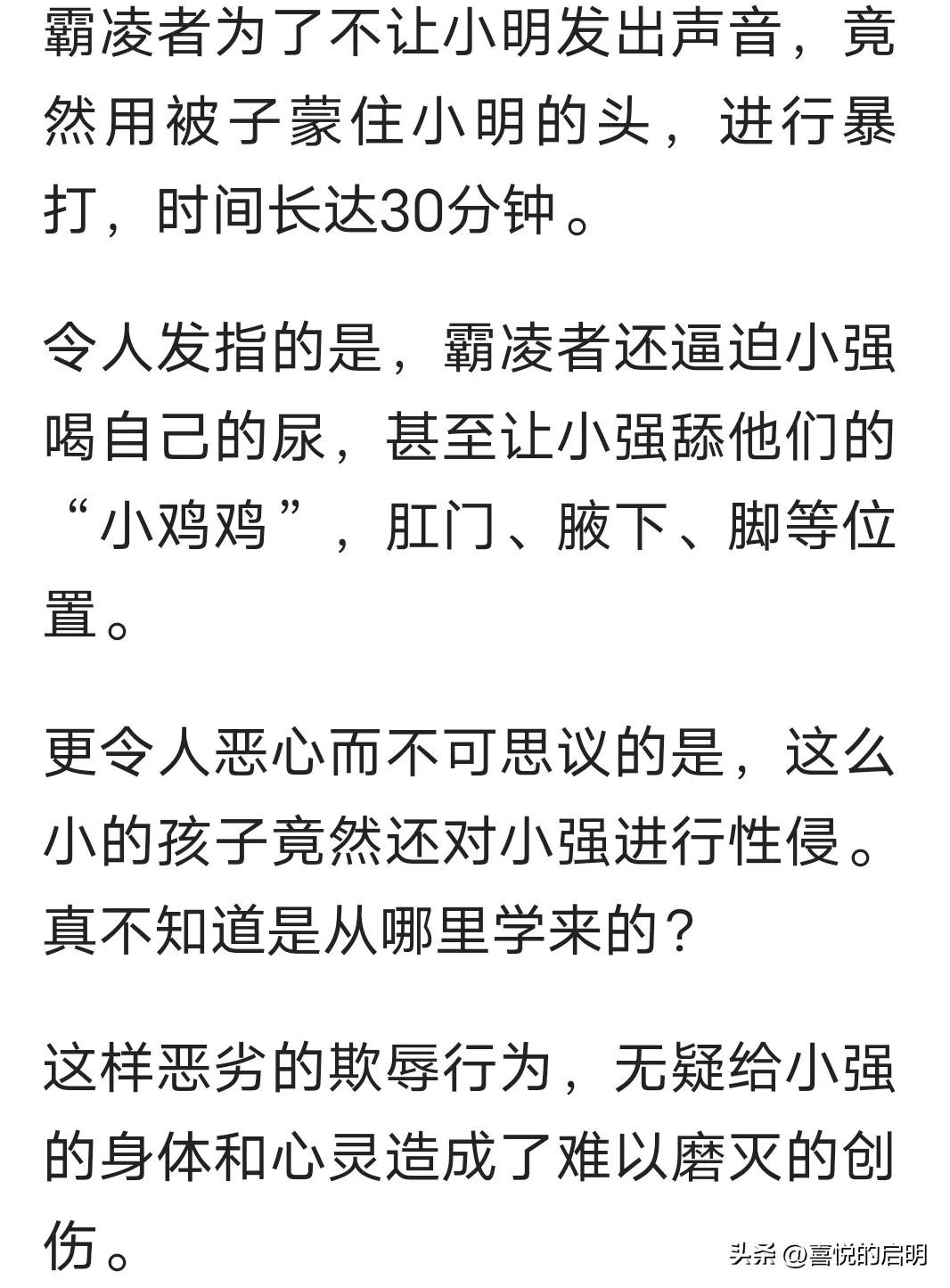 详细细节:霸凌者为了不让小明发出声音,竟然用被子蒙住小明的头,进行暴打,时间长达30分钟。令人发指的是,霸凌者还逼迫小强喝自己的尿,甚至让小强舔他们的小鸡鸡,肛门、腋下、脚等位置。