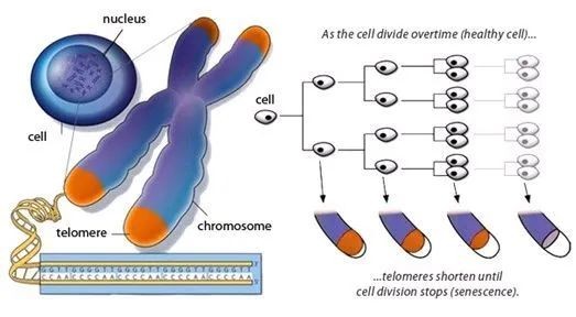 细胞每分裂一次,染色体末端就会损耗一点,而端粒就像是加在染色体上的帽子,可以避免染色体受损。一旦端粒被磨损耗尽,染色体开始受到损害,那么就会诱导细胞的凋亡机制。