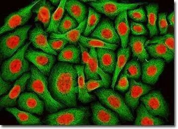 经荧光染色的海拉细胞,图片提供:Tom Deerinck。