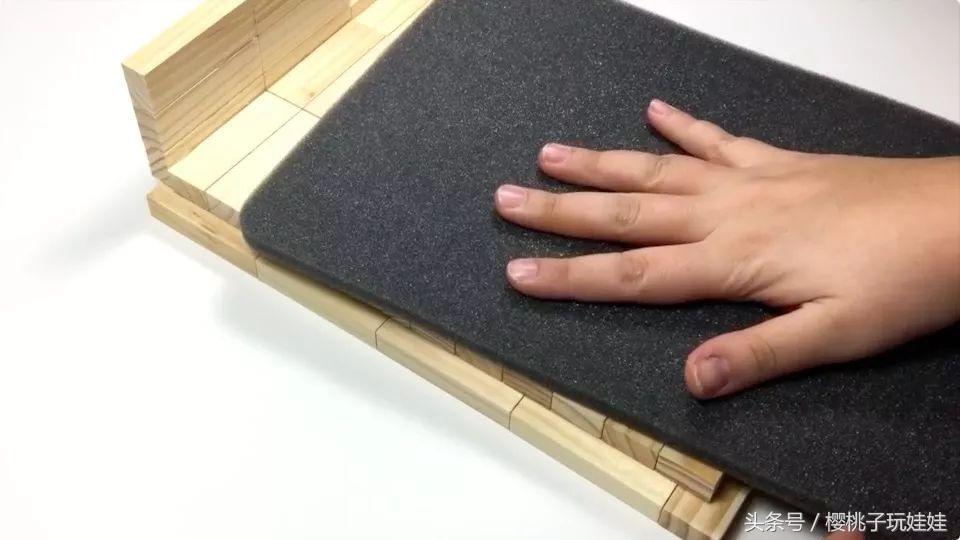 9、拿出泡沫海绵,剪出床板大小的一块。