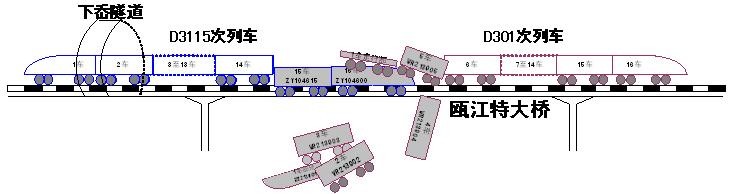 事故造成D3115次列车第15、16位车辆脱轨,D301次列车第1至5位车辆脱轨(其中第2、3位车辆坠落瓯江特大桥下,第4位车辆悬空,第1位车辆除走行部之外车头及车体散落桥下;第1位车辆走行部压在D3115次列车第16位车辆前半部,第5位车辆部分压在D3115次列车第16位车辆后半部),现场一片狼藉。