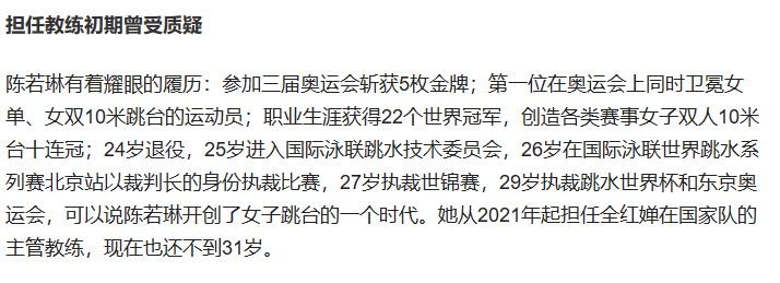 即使是回到国家队担任主管教练时,她也才29岁。但即使优秀如陈若琳,也是遭受过很多质疑的。