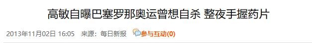 原文刊载于每日新报2013年11月02日关于“高敏自曝巴塞罗那奥运曾想自杀 整夜手握药片”