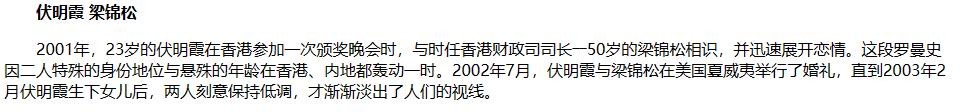 她与丈夫梁锦松的相识,还要追溯到2001年。当时23岁的伏明霞来到香港参加晚会,50岁时任香港财政司司长的梁锦松也来参加同场晚会。