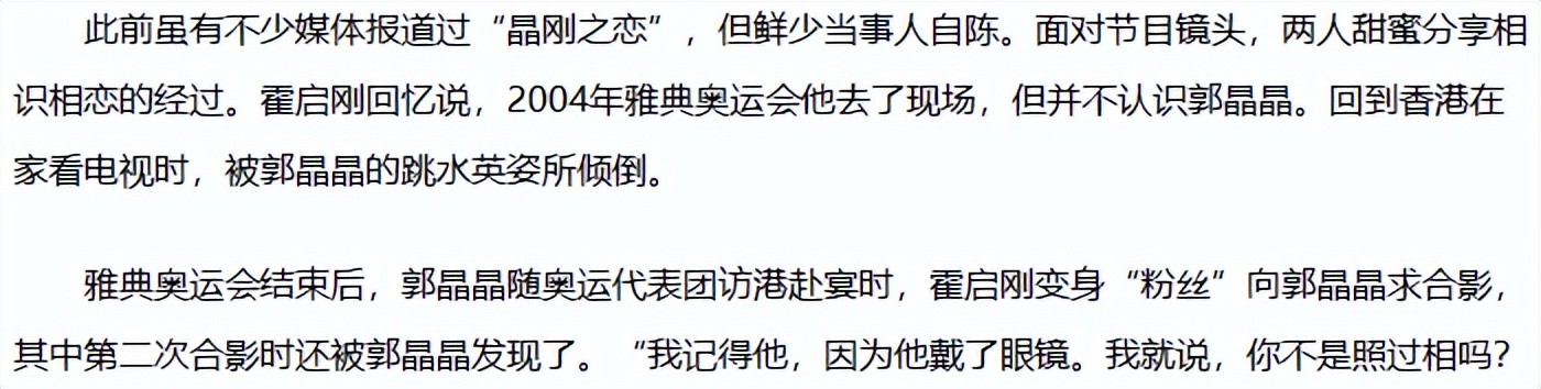 虽然当时郭晶晶已经出名了,但长期生活过在香港的霍启刚还并不知道郭晶晶是谁。后来在家偶然看电视,就看到郭晶晶跳水,霍启刚一下子就被吸引住了。