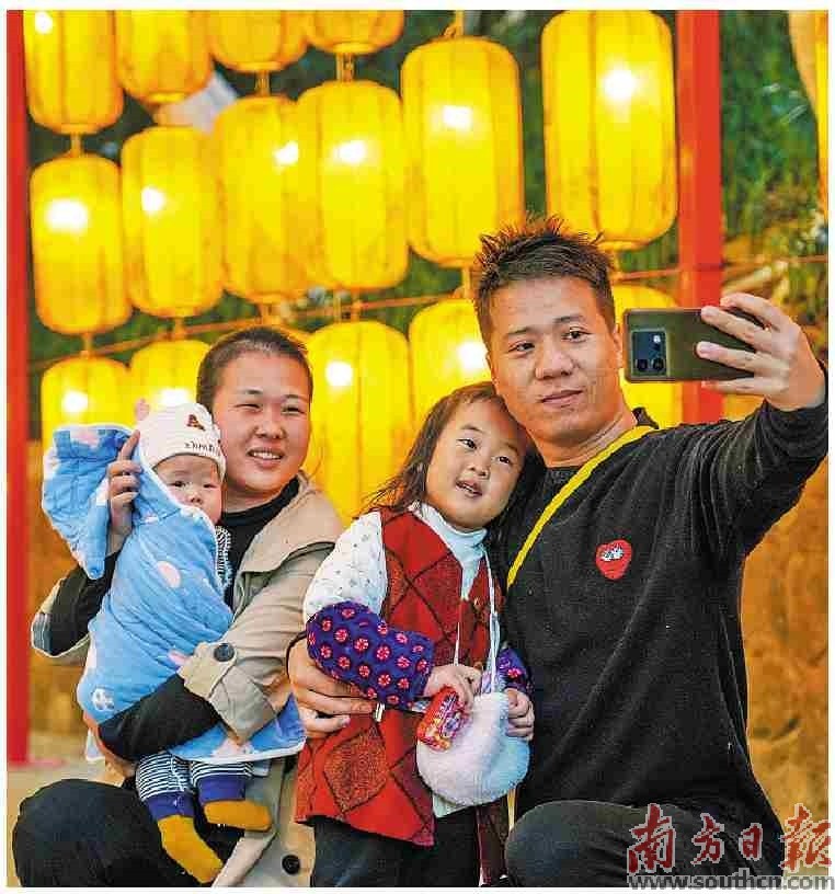 一家四口在共乐园灯会打卡,自拍全家福。