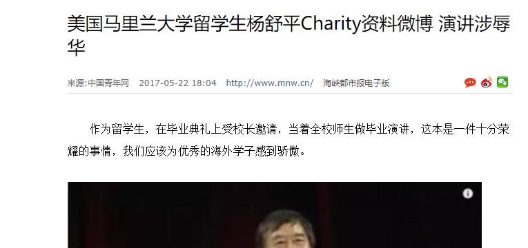 中国青年网2017-05-22《美国马里兰大学留学生杨舒平Charity资料微博 演讲涉辱华》