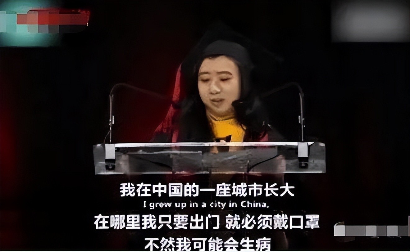 她在演讲中提到,自己刚到美国时,几乎每次出门都需要戴上口罩,因为中国的空气质量太差,雾霾严重。