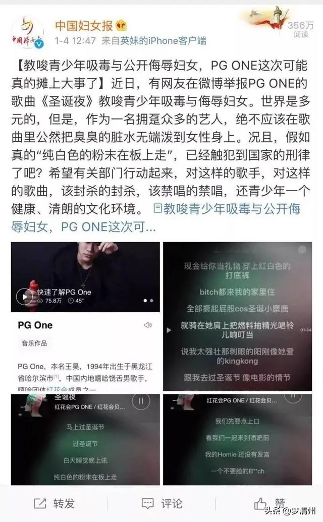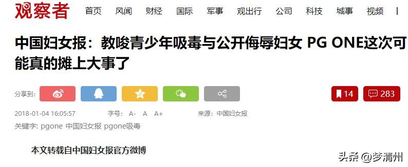 观察者网2018.01.04——中国妇女报:教唆青少年吸毒与公开侮辱妇女 PG ONE这次可能真的摊上大事了