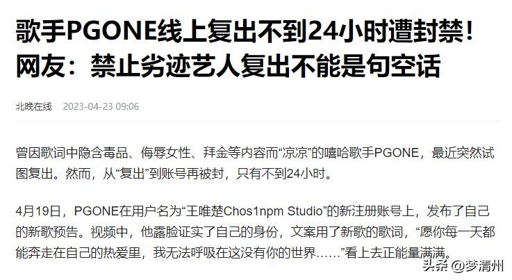 北晚在线2023-04-23——歌手PGONE线上复出不到24小时遭封禁!网友:禁止劣迹艺人复出不能是句空话