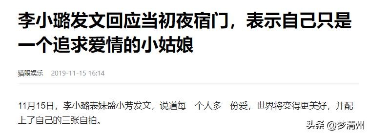 猫眼娱乐2019-11-15——李小璐发文回应当初夜宿门,表示自己只是一个追求爱情的小姑娘