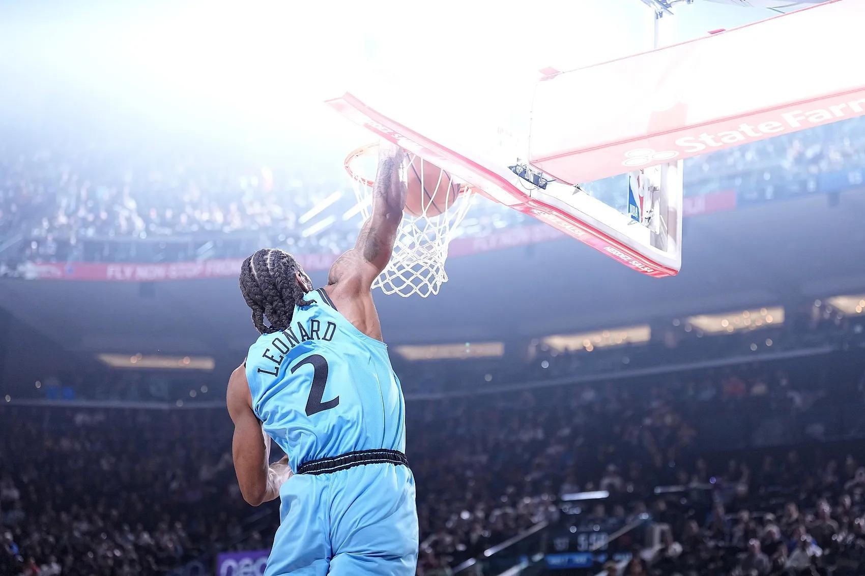季后赛,伦纳德打了4场,砍下106分29篮板7抢断,投篮73投41中,三分21投10中,16罚14中,快船队;