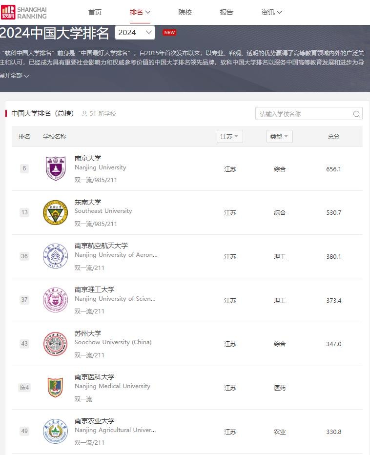 江苏高校2024全国排名,南京大学第六,东南大学第13名