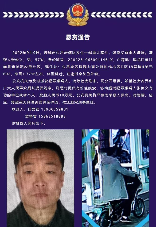 此前,东昌府分局曾发布关于此案的悬赏通告,希望社会各界和广大人民群众踊跃提供线索,凡是对提供有价值线索、协助缉捕犯罪嫌疑人张俊义有功的单位或者个人,奖励人民币10万元。
