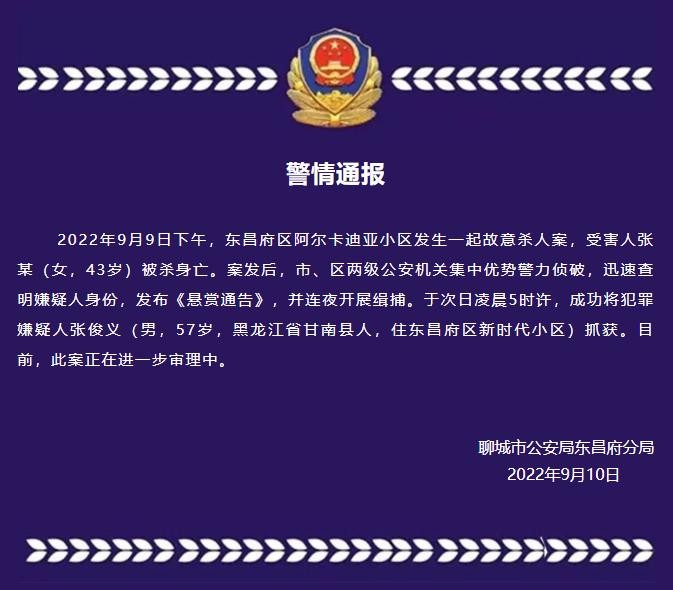 9月10日上午,山东聊城市公安局东昌府分局发布一则警情通报。据通报称,2022年9月9日下午,东昌府区阿尔卡迪亚小区发生一起故意杀人案,一名43岁的女子张某被杀身亡。次日凌晨5时许,警方成功将犯罪嫌疑人、57岁的男子张俊义抓获。