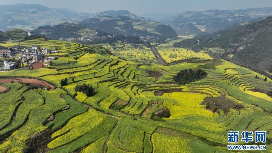 油菜花海与山峦、村寨、道路共同勾勒出一幅生机勃勃的田园画卷。新华网发(孙文来 摄)