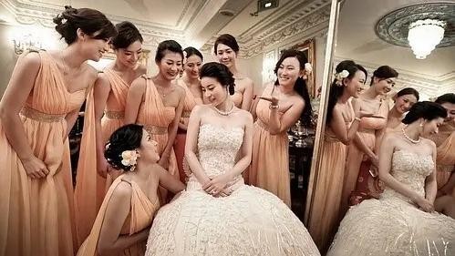 跟baby为伴娘们选择的廉价淘宝服不同,郭晶晶的伴娘服十分的优雅,礼服都是希腊女神风格的,香槟色调也很温暖柔和,为了丰富造型,每一位伴娘的头上还都戴了一会鲜花做装饰,一群人众星拱月般的围绕着郭晶晶,白色的婚纱在香槟色的映衬下显得格外的抢眼,这张照片也成为了经典。