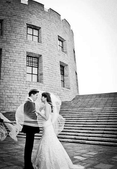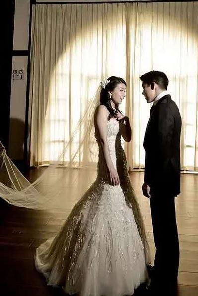 婚纱照中,郭晶晶一头蓬松的长发柔顺的披散在身后,难得的女神范,身上穿着一件白色抹胸款婚纱,款式修身完全是量身定做的,完美勾勒出了郭晶晶的身材曲线,裙摆微微撑开,最外面遍布着精致的蕾丝纹样,钻石耳环和脖子间佩戴的项链也是价值不菲,霍启刚穿着一身黑色的西装,面对着郭晶晶,脸上满是羞涩的笑容,一层宽大的薄纱罩在头顶上,为画面增加了一点梦幻的色彩。