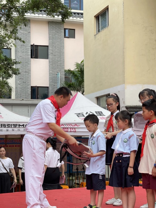 下午三点,仪式开始前,少先队员代表为前来的领导和嘉宾敬献红领巾。接下来,鼓号队的队员们奏响激昂奋进的《出旗曲》,出旗手和护旗手迈着整齐的步伐出队旗,全体队员们放声高唱中国少年先锋队队歌《我们是共产主义接班人》,仪式正式开始!