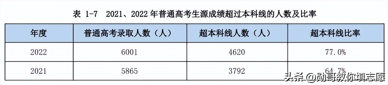 以2021-2022年生源质量的数据来看,2021年有64.7%的考生超过本科线填报这所大学,2022年有77%的考生超过本科线报考这所大学。换句话说,这所大学虽然是专科,但实际上生源质量已经是本科院校的质量了。