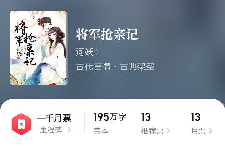 大家好,我是琴瑟花,花姐今天又来推书啦!今天花姐要来推荐一本完结古言小说,作者是大名鼎鼎的河妖,小说名字叫做《将军抢亲记》,195万字,已完结。