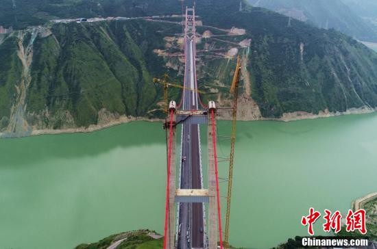 雅康高速泸康段“川藏第一桥”大渡河兴康特大桥已进入柏油路面铺设等阶段。