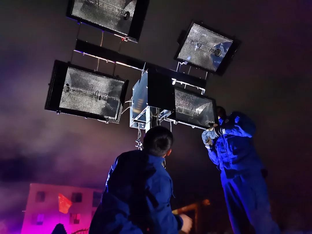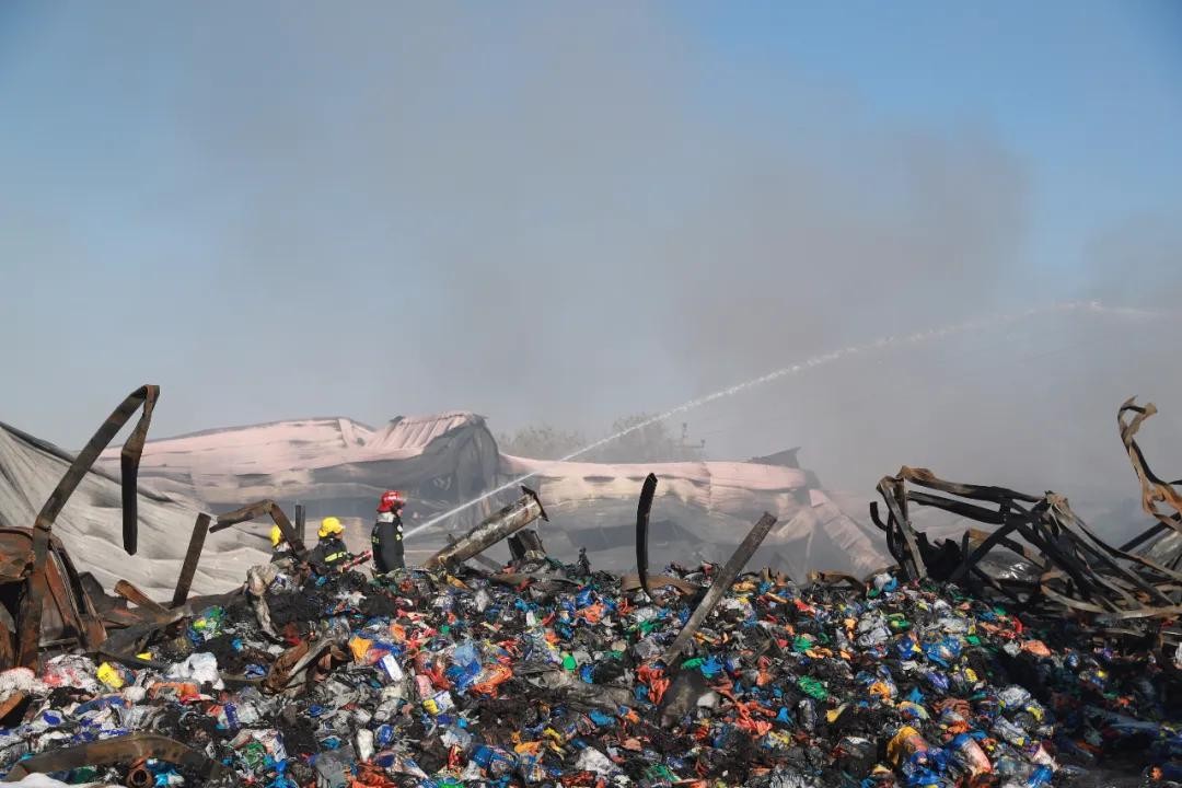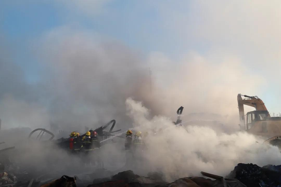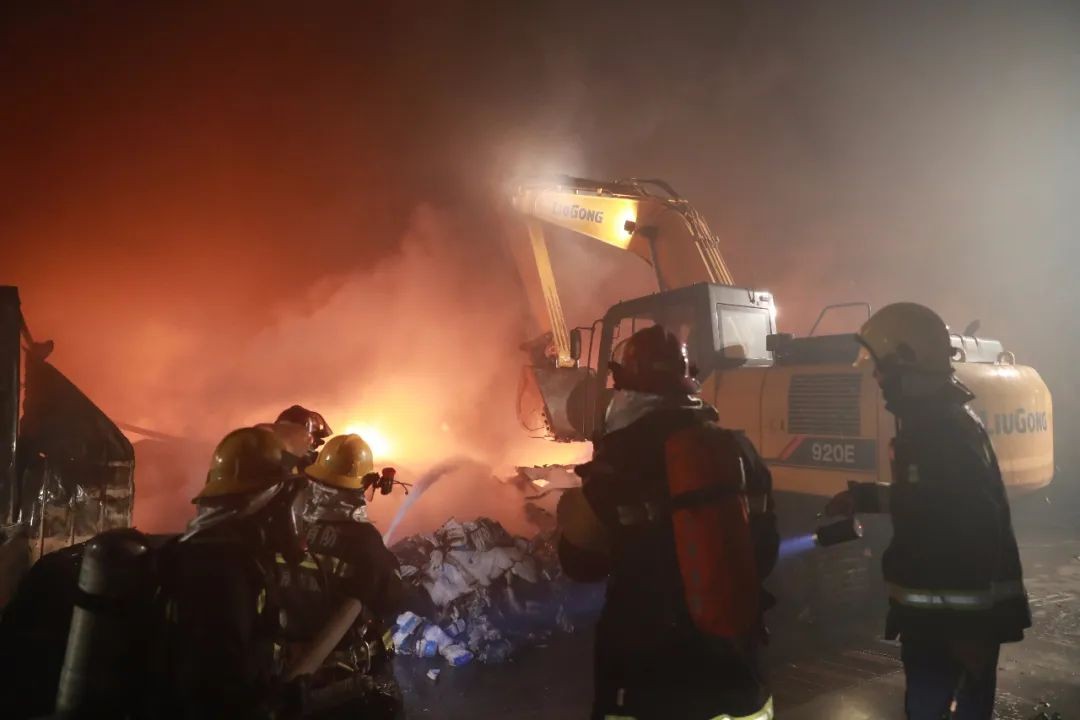 夜黑风大,寒气袭人,消防指战员冲进烟雾和毒气中展开灭火战斗。由于彩钢板库房坍塌后,水枪难以触及火点,指挥中心立即调派重型工程机械救援大队指战员到场,协助破拆灭火。同时竖起大型照明组,用于火场照明。
