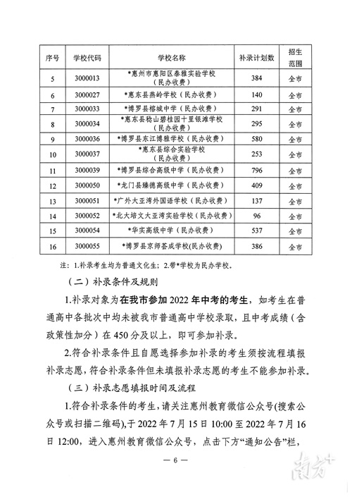 公告提到,未完成招生计划的部分学校将开展补录工作。在惠州市参加2022年中考的考生,如考生在普通高中各批次中均未被惠州普通高中学校录取,且中考成绩(含政策性加分)在450分及以上,即可参加补录。