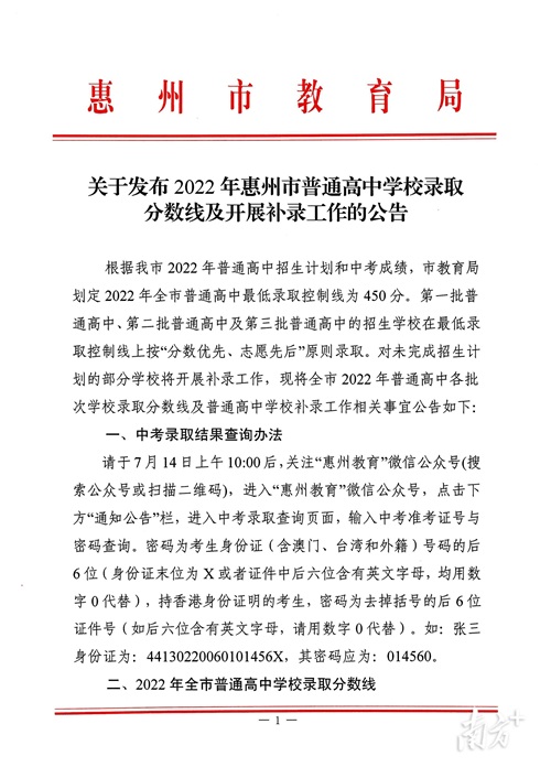 权威发布!2022年惠州普通高中录取分数线出炉(附补录公告)