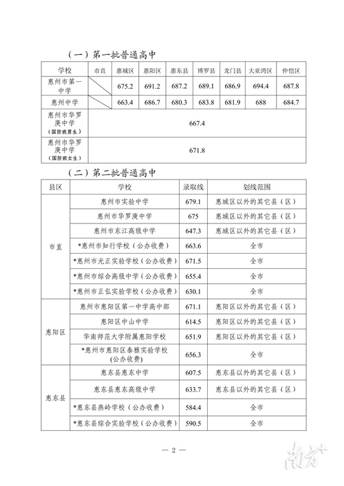在第一批普通高中学校中,惠州市第一中学在惠城区的录取分数线为675.2;惠州中学在惠城区录取分数线为663.4;惠州市华罗庚中学国防班在全市的录取分数线为667.4(男生)、671.8(女生)。