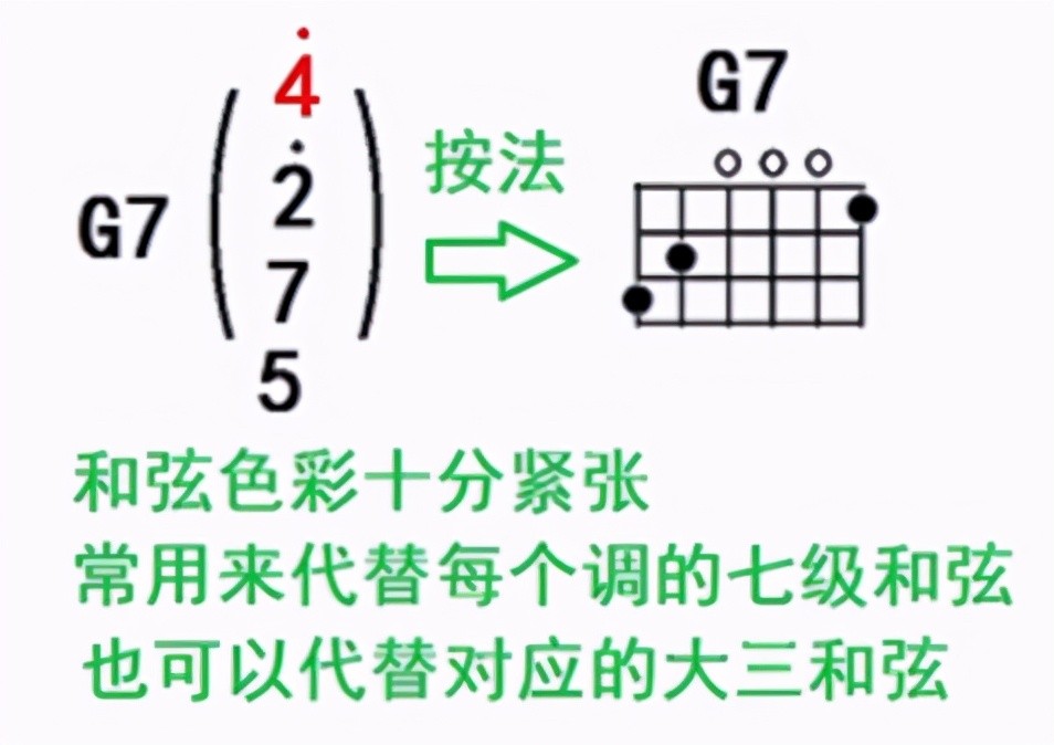 也可以代替对应的大三和弦,你像在弹唱中可以把G和弦用G7来代替