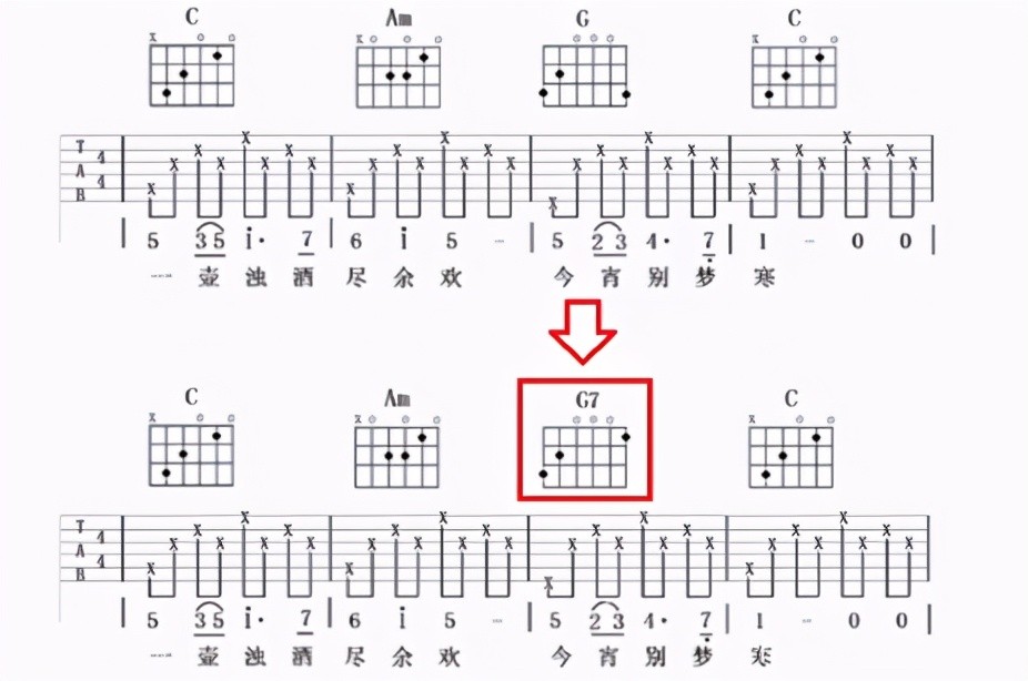 如果你身边有吉他,可以拿起琴来,把这个乐句,分别用G和G7来对比一下