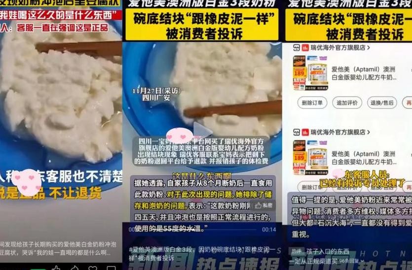 再次被曝光!四川女子哭诉给宝宝喝的爱他美奶粉碗底结块像橡皮泥