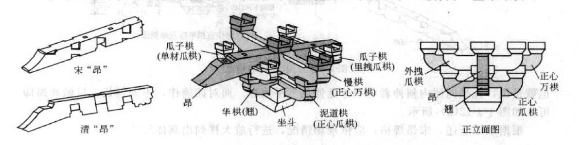 (4)昂,“昂”是唐宋时期演化而来的一个构建,当时利用杠杆作用,起到对屋顶支撑作用的斜置构件,后因它的安全度受到挑战,到明清则是不起力学作用的装饰构件了。