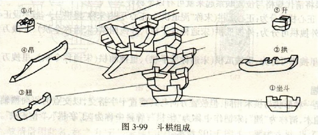 (2)拱,“拱”是嵌入座斗上的第二层承托拱件,他的摆放平行于建筑长边,形如弓形,中间开凿槽口。