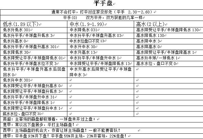一般认为两队胜、平、负机会相等的情况下开出的盘口,博彩公司对一场比赛开出来平手盘,本身就说明比赛双方的实力旗鼓相当。我们只能从贴水的高低来区别判断本场比赛的基本走势;如前所述,平手盘当然是低水方稍有优势,但大多数是因为主队有主场的优势,仅此而已。每逢遇见势均力敌的比赛往往进球就会比较的少,那么从大势上判断上看小球就是一个不错的选择。需要特别注意的是;超低水平手盘的比赛,首选的是小球,其次临场投注应该选择低水的一方球队。