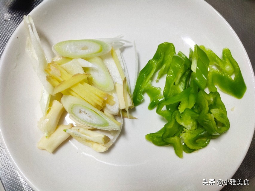 2.将葱切段,姜切成丝,蒜拍扁,青椒切段备用。