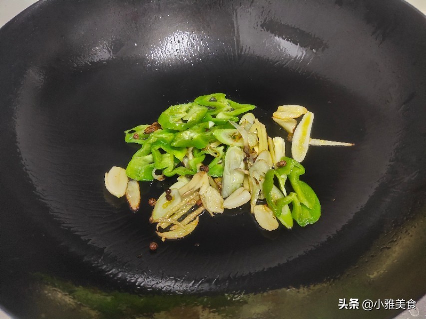 4.另起锅,锅温热后倒入适量的食用油,油热后倒入准备好的葱、姜、蒜、花椒爆炒,然后再倒入青椒翻炒几下断生。
