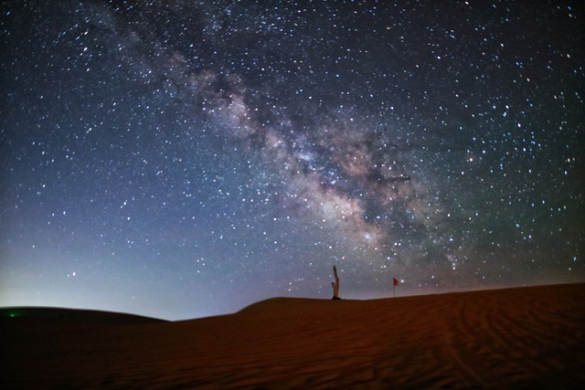 晚上,在腾格里沙漠帐篷露营,抬头仰望璀璨的星空,参加盛大的篝火晚会,尽情唱歌聊天。