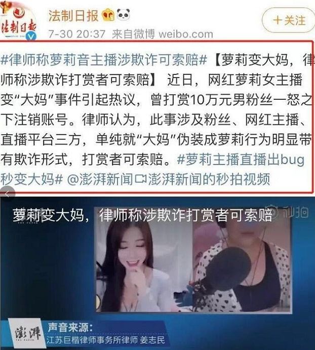 不过说回乔碧萝殿下这事,不用小见见说大家也能知道她之前使用的图片是盗用了另一个美女小姐姐图片,目前当事人已经准备起诉乔碧萝殿下侵犯肖像权了。而近日又有律师认为乔碧萝殿下之前伪装称萝莉的行为带有欺诈性,之前打赏的观众可以索赔。