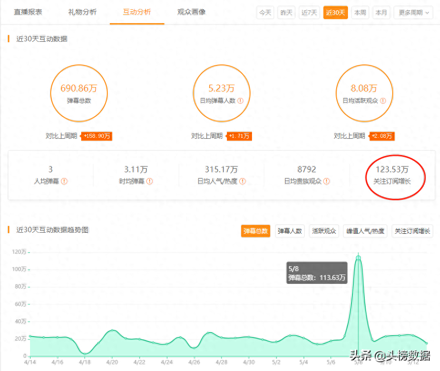 数据显示,团团在近三十天的关注订阅增长123.53万,同周期对比日均活跃观众上涨2.08万,日均弹幕人数与弹幕总数皆出现较大幅度增长。值得注意的是,团团的关注订阅数据出现大幅度增长趋势是在4月30号之后,日均订阅观众相比此前的数据,呈现翻倍增长状态,这个时段恰好是"嘟嘟歌"逐渐刷屏抖音时间点。