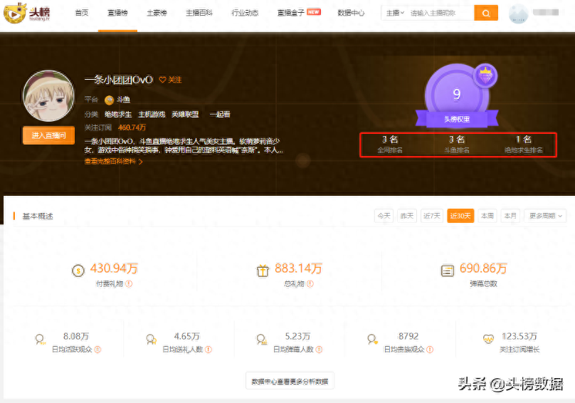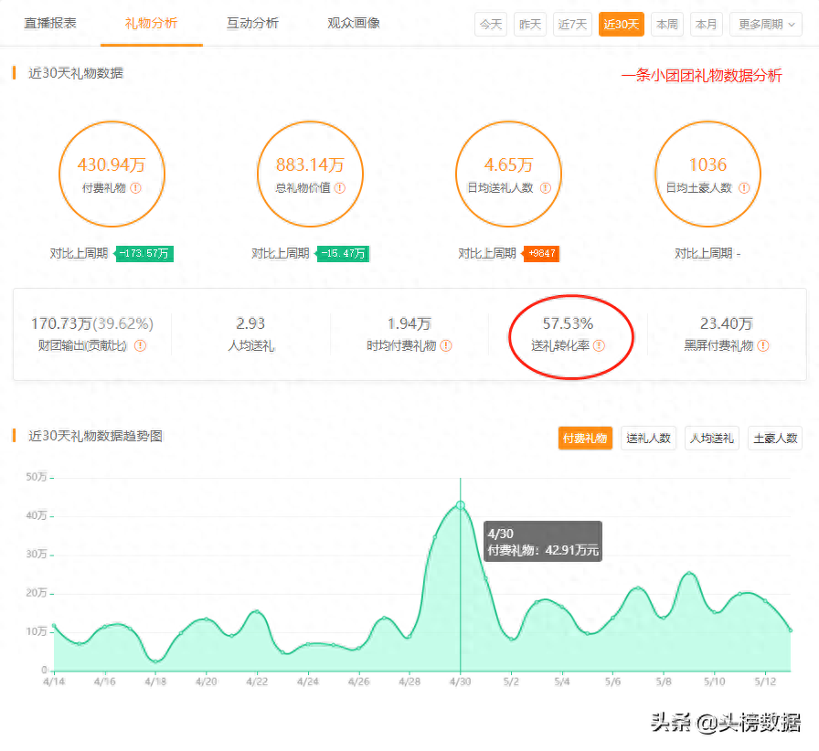 互动数据的大幅上涨,也带动了团团直播间礼物流水数据的增长。近三十天直播间收到的总礼物价值高达883.14万,付费礼物收入达到430.94万。从数据面板看,同周期虽然有所下降,但这与上个月斗鱼举办的粉丝节活动刺激流水有关。此外,团团在关注订阅大幅度增长状态下,依然能够保持在57.53%。这意味着其直播间流量增长的同时,这部分新流量在观看直播后也愿意为了直播内容付费支持。