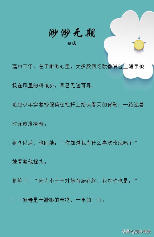 归渔的《渺渺无期》于渺渺十年如一日的暗恋颜倦,校园中的一个背影,却让自己挪不开眼,你在我心中就是小王子,而我就是玫瑰花。主要是校园情节,女生前期暗恋,这是一本暗恋成真的日记,里面有很多青涩的少女心事,和一个最好的少年。