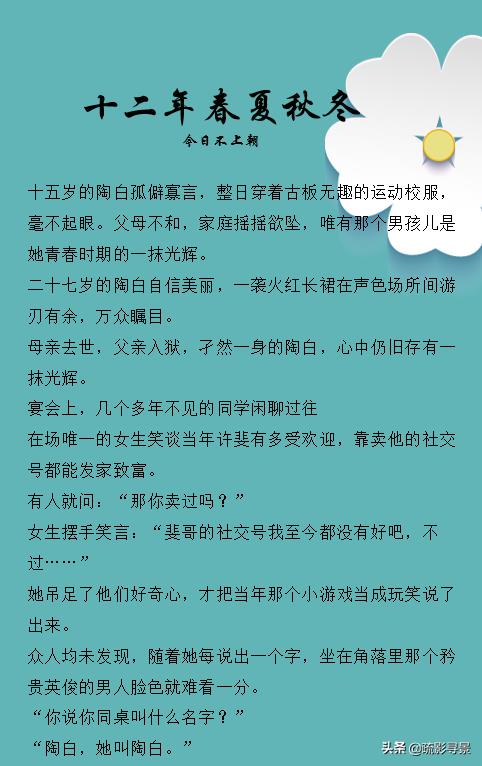 今日不上朝的《十二年春夏秋冬》暗恋成真,单箭头向双箭头进击。但凡暗恋,总归酸涩。有一个巨大误会与现实原因导致十年分离。酸酸甜甜,前期互动少,后期互动多并甜。