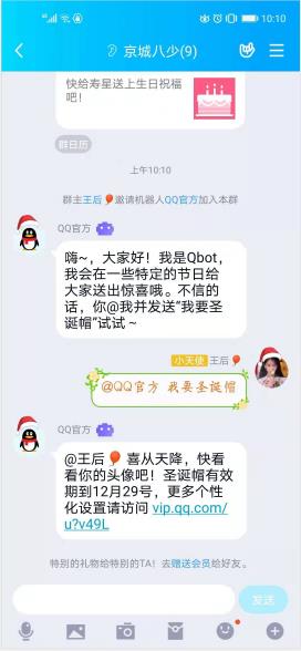 进入有此机器人的QQ群后,直接@QQ官方 我要圣诞帽即可,下一秒你会收到官方的回复,你的头像也会戴上圣诞帽了!